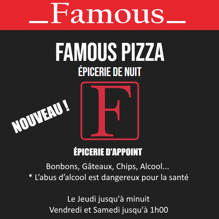 la Pizzeria Famous pizza met à votre disposition tout son savoir-faire et vous assure dès votre arrivée un accueil chaleureux.